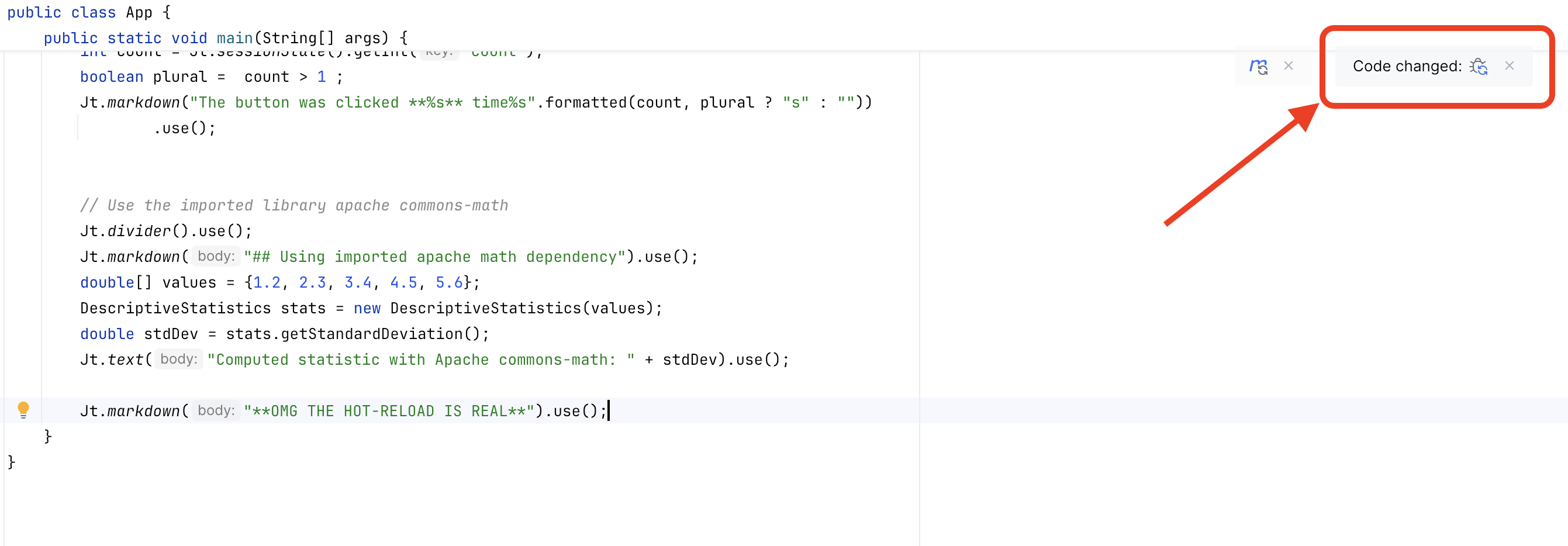 and add some code, for example:Jt.markdown("**OMG THE HOT-RELOAD IS REAL**").use();
